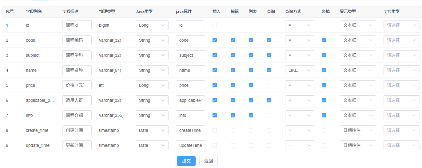 id:因为是自增的,所以不需要勾选create_time和update_time因为我们是数据库自动填充的,因此不需要勾选
