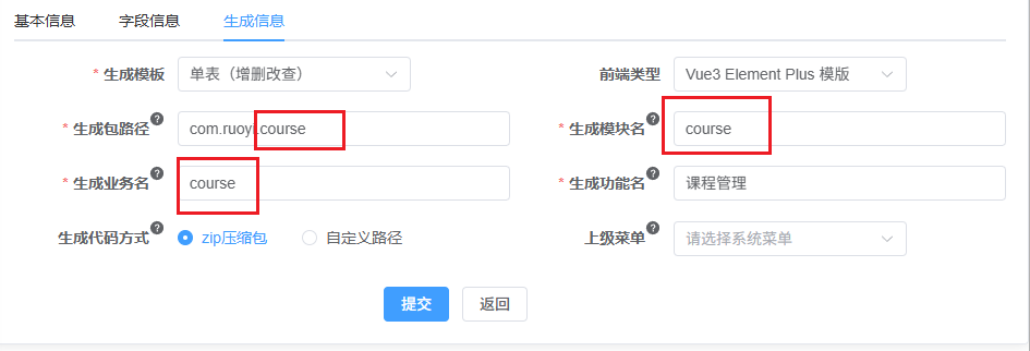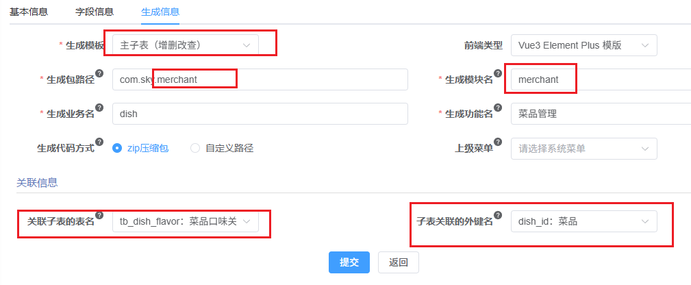 上来第一步基本信息改一下,实体类名称=tbDish=Dish,去掉前缀,改下作者名