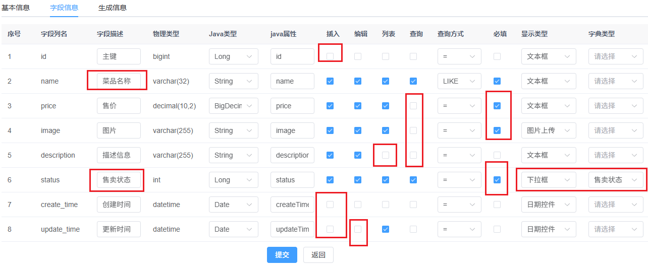 插入:ID是自增的所以去掉、创建和更新时间之后是自动填充的。编辑:和插入保持一致列表:不需要展示描述信息查询:只需要根据name和status查询- 需要添加 售卖状态